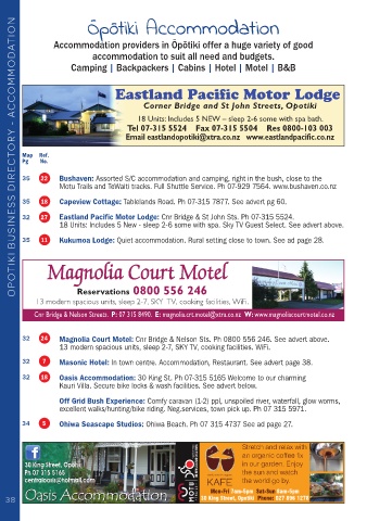 35 11 Kukumoa Lodge: Quiet accommodation. Rural setting close to town. See ad page 28.